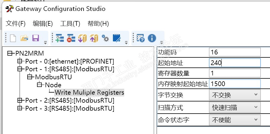 17、Profinet转Modbus485网关的写入配置如下,地址写入F0H的十进制数即240,寄存器数量为1内存映射地址1500对应PLC的Q地址第一个字节;