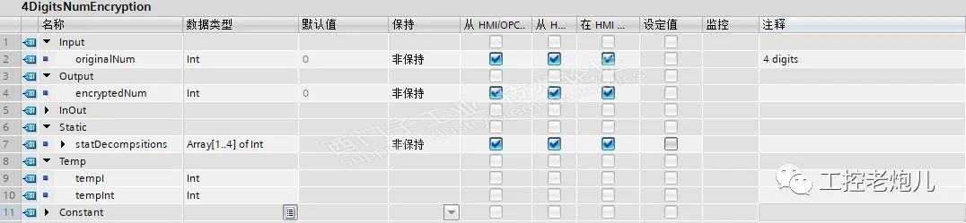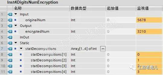 在循环OB中调用FB- “4DigitsNumEncryption”,调用时会自动创建背景数据块,命名为“Inst4DigitsNumEncryption”,该背景数据块可以用来监视和修改数据。