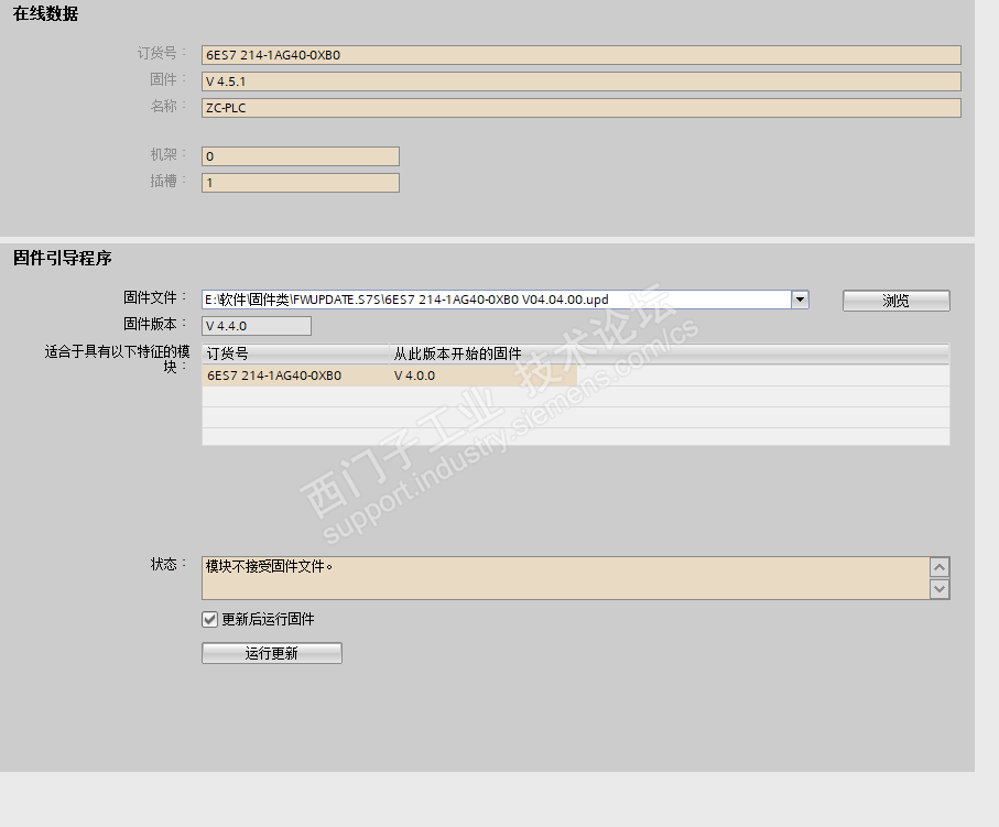 项目需要将新买的4.5.1的1214降到4.4.0,出现上诉报错,模块不接受固件文件,升级到4.6可以,再从4.6降到4.5也可以,就是不能降到4.4,博图用的是V16,没钱升级电脑换新博图,如果用V4.5的版本,绝对值V90断电不能保存位置,所以必须降到4.4,哪位大神知道怎么回事,指导一下