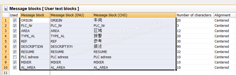从以上的截图中,可以看出,报警消息块中的“用户文本块1”和“用户文本块6”,没有按照图片1里的消息块中英文对照显示成正确的正文(正确的应该是:“用户文本块1”对应显示为“车间”,“用户文本块6”对应显示为“描述”),其它的消息块是可以正确显示成中文的。