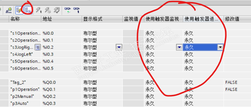 另外,由于PLC过程映像区的更新机制,使用监控表修改IO点的状态需要打开扩展模式列,在触发器列设置永久。