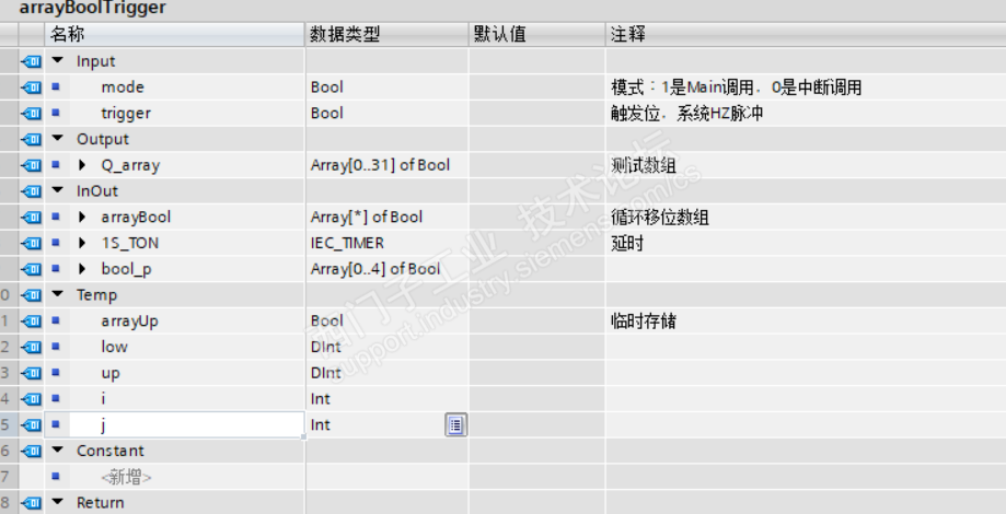 ***实现和循环移位指令类似功能,是从布尔数组的下限到上限之间从下限开始每次递增。可在Main或中断调用。Main程序每次触发或循环中断每次扫描都会使布尔数组下限+1递增循环。