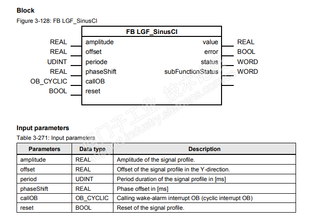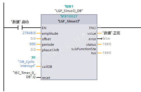根据资料说明配置功能块。为了保证波形周期,J将SIN功能块放到使用循环中断OB30中,并根据项目需要设置循环时间。