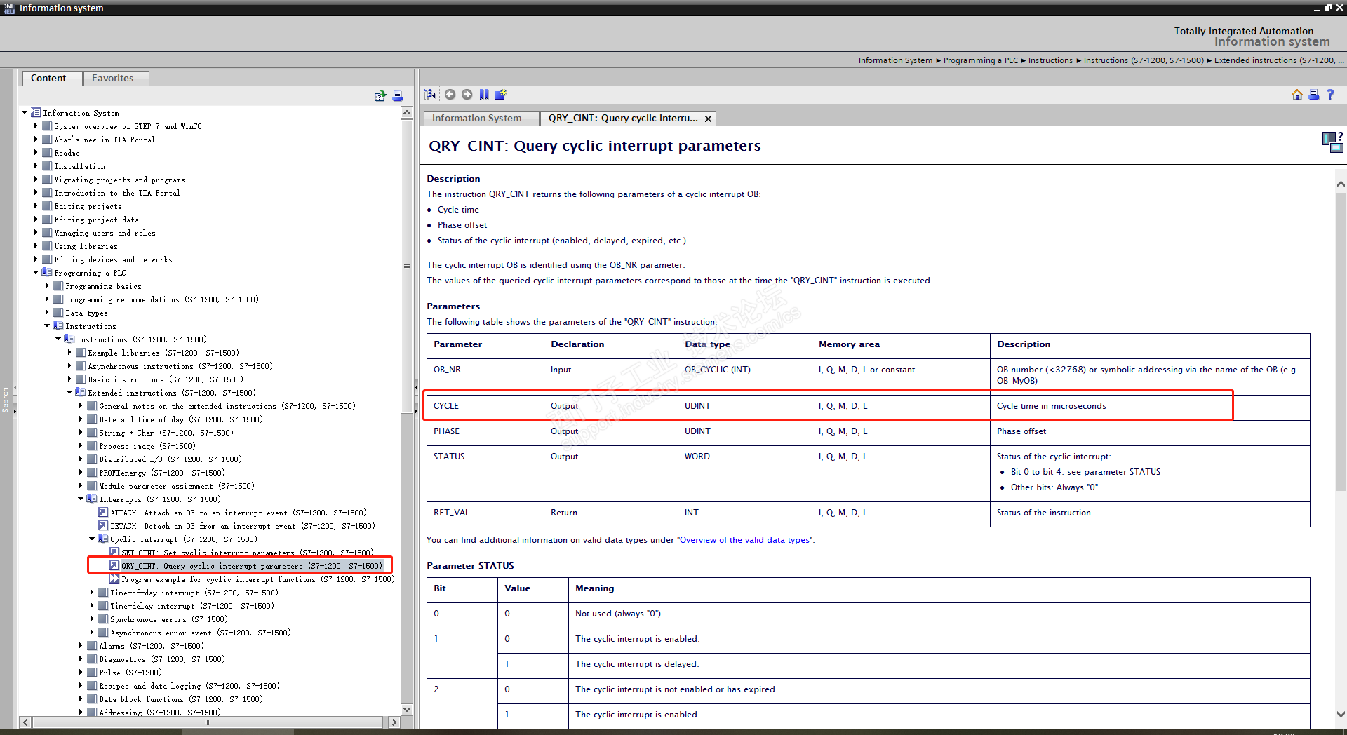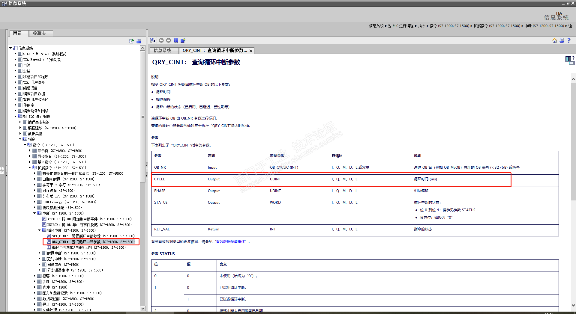 最近在封装一个需要在循环中断中调用的FB,用到QRY_CINT这个指令的时候,首先的想法就是打开帮助文档查看用法,可是按照帮助文档里面的说明调用了指令的时候,返回的结果却令我迷茫了,这这这,,这根帮助文档里面的对不上啊,于是我就开启了钻牛角尖模式,我分别查看了中文帮助文档和英文帮助文档,又分别在1200和1500中调用了指令,最终让我豁然开朗。