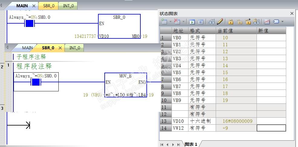 大家可以看到第一个图为何状态表中有VD10这项?而且数值是16#08000009?这是因为我开始的时候需要先向VD10输入一个指针格式的数据(16#08000000我必须用16进制书写),然后再从指针的低16位改写成我需要的地址(我用十进制书写比较直观)。所以我要分开两次输入。