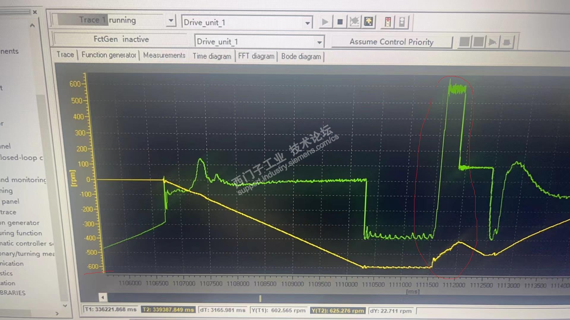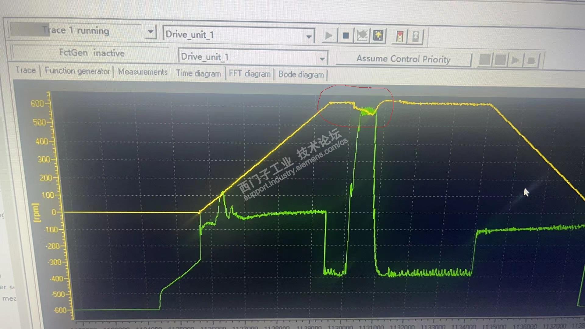 调试过程中问题1:STEP7程序中的停车命令是W#16#400,因为S120的自由停车命令不也是400吗,所以就认为是自由停车,还是使用的这一命令。但是应用到实际电机正转后自由停车因为没有抱闸,一直到反转开始都无法停止。就造成反转最终速度不够。最终还是使用的047E,达到的实际效果就是正转结束4S停止,等待钢坯过来再进行反转,与现场原本效果一致。