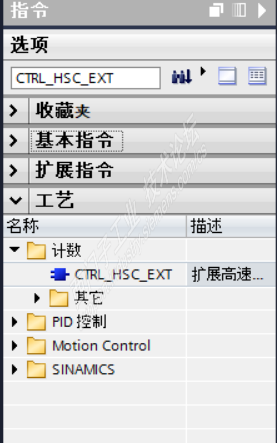 所有西门子内置指令均可在功能块右侧的“指令”菜单栏中通过搜索找到:
