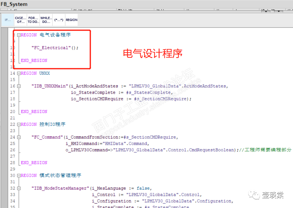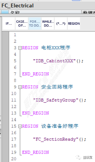 标准程序架构中,函数FC_Electrical即为电气设计程序的合集,在FB_System中的“电气设备程序”区间(Region)是被调用。