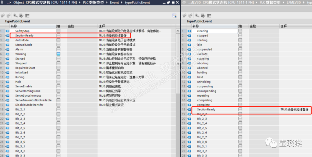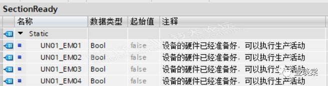 每一个对象的SectionReady的数据类型是布尔型(BOOL),当该变量为TRUE的时候,则意味着这台设备的硬件已经准备好,即该设备的主电源、控制电源、通信的连接都是正常的,可以执行生产活动。