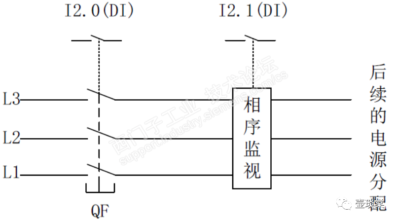 为了检测整个三相电源是否有电且电源的相序是否正确,在进线后配置一个相序检测的元件,同时提供一个故障反馈开关接入PLC的输入模块的I2.1地址,只要该地址的电平为TRUE即意味着电源是有电且没有故障。