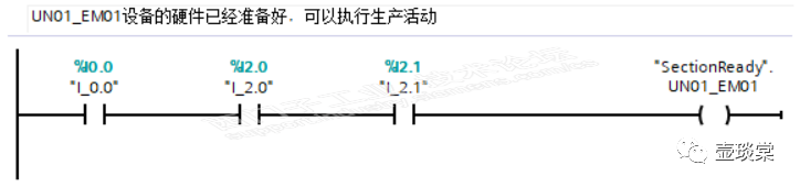 此时设备运行的前提或者设备准备好的要求是I0.0、I2.0以及I2.1是TRUE,如下图所示。