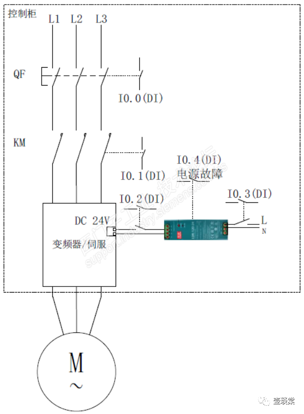 变频非通信的电气设计如上图,QF和KM为变频提供主电源,变频的控制单元的电源是直流24V,而直流24V电源的输入电源是交流220电源,且24V电源也提供一个故障反馈的输出点并接入到PLC的输入模块。