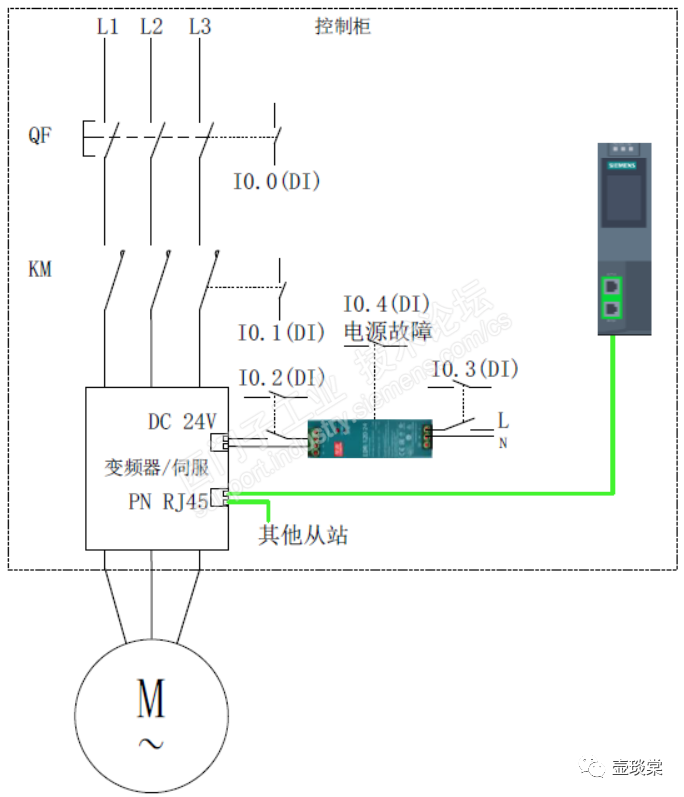 变频非直连通信的电气设计如上图,QF和KM为变频提供主电源,变频的控制单元的电源是直流24V,而直流24V电源的输入电源是交流220电源,且24V电源也提供一个故障反馈的输出点并接入到PLC的输入模块。