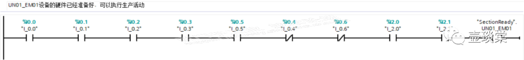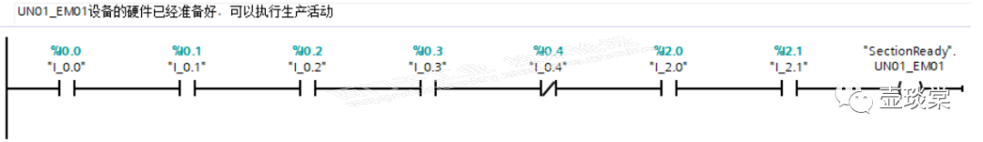 此时设备运行的前提或者设备准备好的要求是I0.0、I0.1、I0.2、I0.3、I2.0以及I2.1是TRUE,I0.4(电源故障反馈)是FALSE。