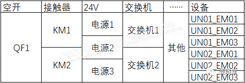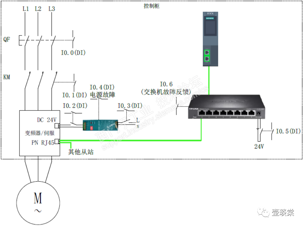 由于系统的复杂性,PLC通过交换机和变频器相连,此时交换机需要一个24V(默认24V电源是同一个)的电源开关并将辅助触点接入PLC的输入模块,同时交换机本身也提供了一个故障反馈点接入PLC的输入模块,用于交换机的故障诊断。