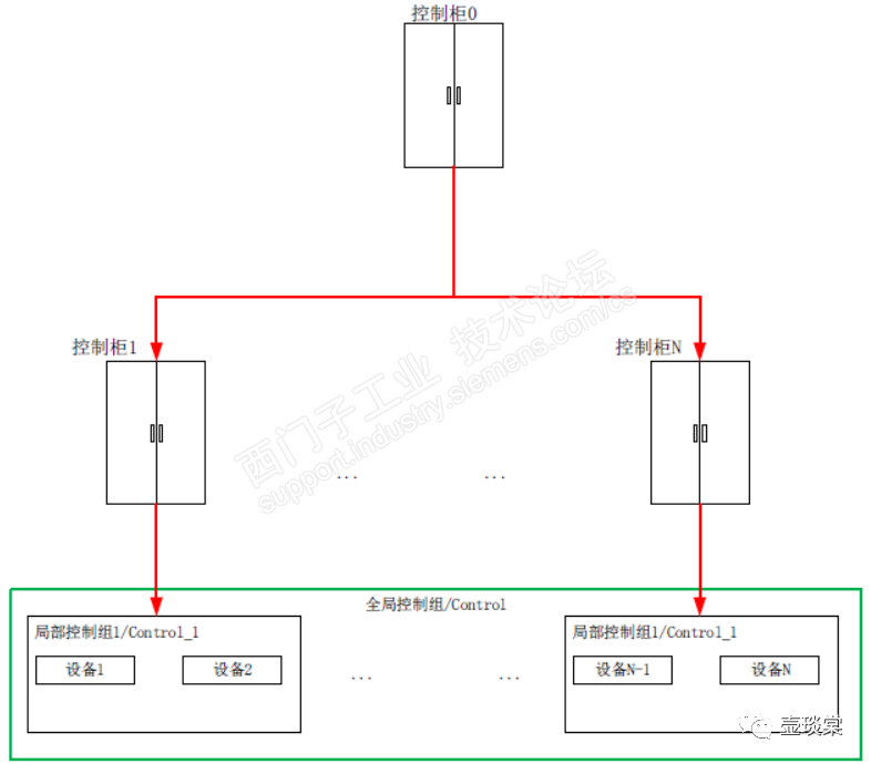 有的设备或者项目比较庞大,一个电气控制柜反而会导致效率低下、柜内空间的不足、现场布线难度增加等问题,所以电气控制柜就会才有分布式设计,采用总+分的原则,PLC放置在总控制柜中,控制柜负责就近的设备,如下图所示。
