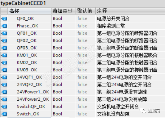 标准程序架构中首先需要建立一个CCC01的电气控制柜的数据类型,数据类型的名称为typeCabinetCCC01,数据结构即电气控制柜中设计的电气元器件。