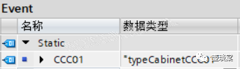 电气控制柜作为一个控制对象,上述数据类型中的数据为电气控制柜的事件,所以其实例化数据是在全局数据块Event中建立对应电气控制柜的实例化数据,如下图的示例一样。
