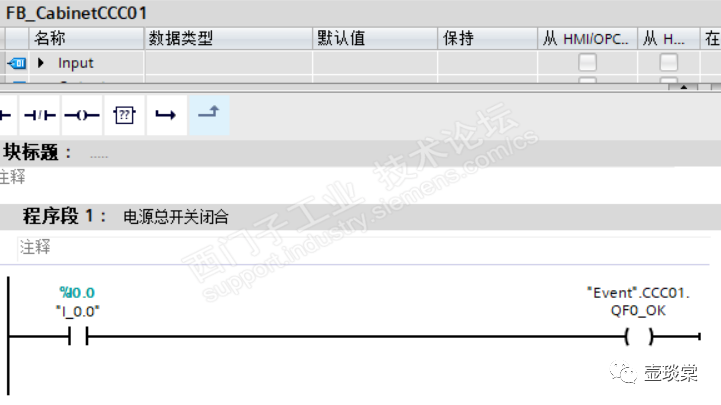 函数块FB_CabinetCCC01中根据实际的输入地址的状态,改变数据块Event中CabinetCCC01的变量的状态,以电源总开关闭合为程序示例,将整个CCC01柜子的当前信息输出到全局数据块Event对应的变量中。
