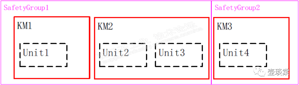 SafetyGroup就是控制上述KM吸合,可以是多个安全按钮断开一个KM的线圈,一个安全按钮也可以控制多个KM的线圈。