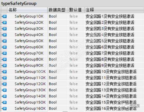 基于上述的描述,标准程序架构中需要先建立一个数据类型typeSafetyGroup,目前预留了16组的安全回路。