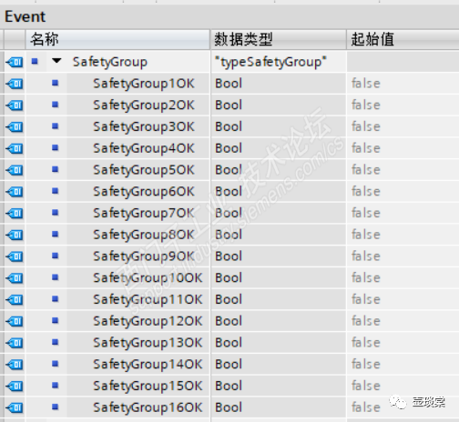 安全回路作为一个控制对象,上述数据类型中的分组为安全回路事件,所以其实例化数据是在全局数据块Event中建立一个安全回路的的实例化数据,如下图的示例一样。
