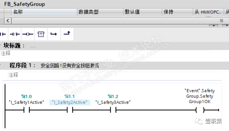 函数块FB_SafetyGroup中根据实际的输入地址的状态,改变数据块Event中SafetyGroup的变量的状态,以SafetyGroup1为例的演示程序如下。