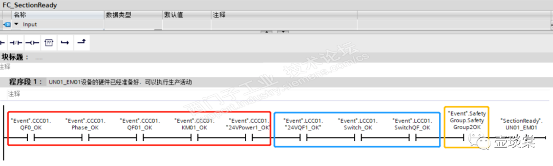 任意设备的SectionReady程序是在函数FC_SectionReady中编程,此时任意设备的SectionReady使用的变量就不想前面章节中显示的实际输入地址,而是来自全局数据块Event中对应控制柜的变量。