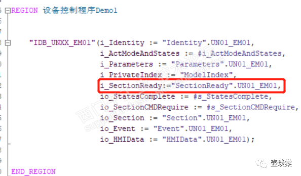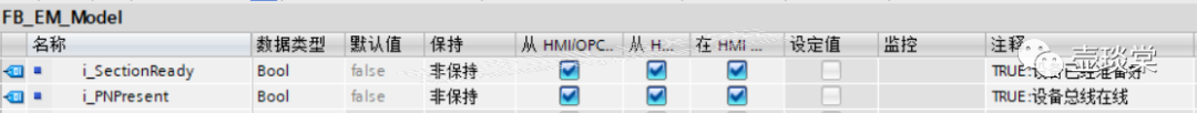 当设备不是通过总线接入PLC的话i_SectionReady引脚即是SectionReady的切换条件,若设备是通过总线接入PLC的话,除了i_SectionReady以外,还需要监视设备是否在线正常,此时FB_EM_Model还需要增加一个名称为i_PNPresent的BOOL类的输入引脚。