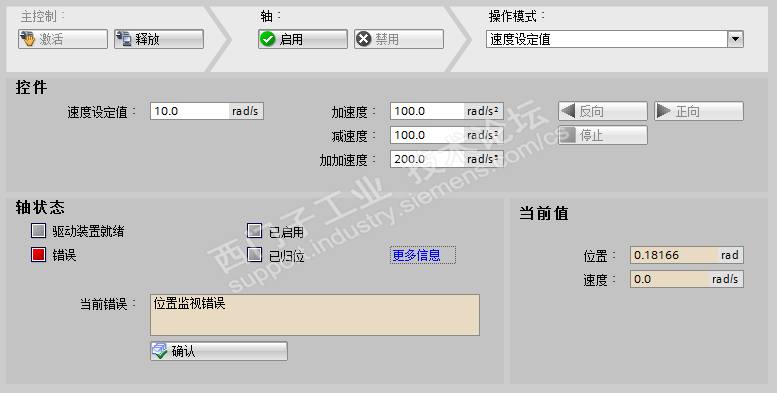 大佬们我想问一下,工艺对象为定位轴,轴类型为旋转。调试正反转没什么问题,但是停止轴后就报错“位置监视错误”,但是我位置监视都是初始值,这是什么原因,有什么解决方法吗