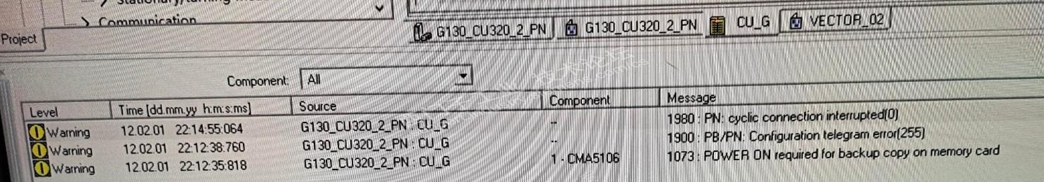 现场有两台G130 250KW的变频器,通过CU320 2PN使用自由报文和300 PLC通信。之前调试过一台已经在用了,现在要在调试一台,CU单元一直找不到。我就把在用的CU单元拆过来用了,参数复制的是在用的那台,因为硬件和电机是一样的。在设置设备名称和IP后,一直报以上报警,COM灯慢闪,RDY亮绿灯。我检查了组态、设备名称和IP是没问题的。就是以下的STARTER中的报文不一样,请问是这个原因吗?谢谢大家!