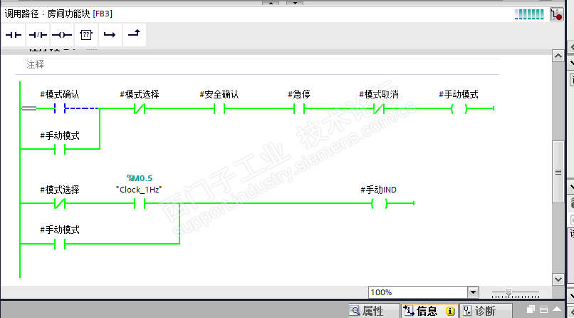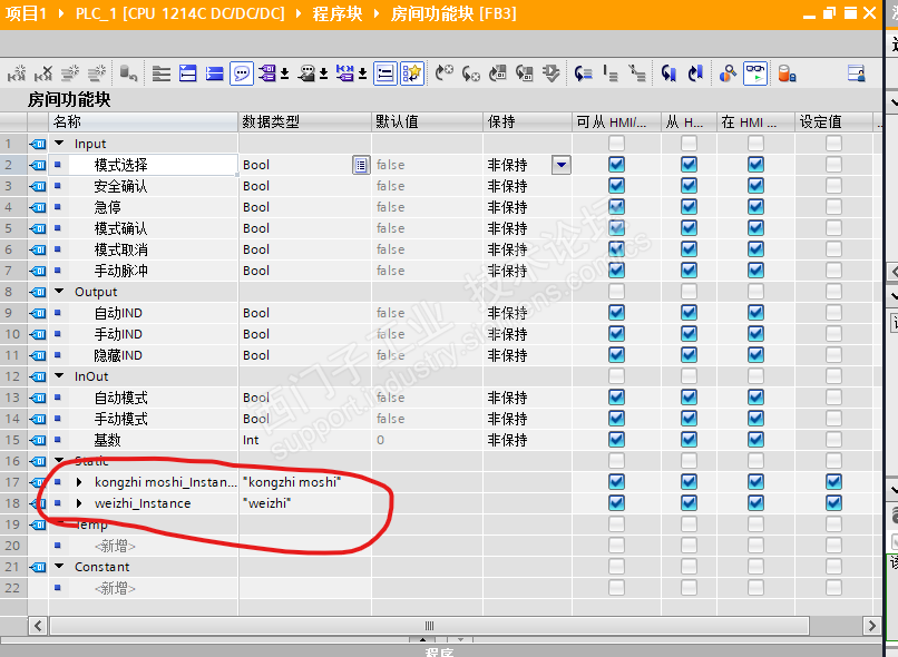 如图,设置了两个FB块,kongzhimoshi和weizhi功能块,新建立一个新FB块,把那kongzhimoshi和weizhiFB功能块放在新FB块里,并且那两个FB快做多重背景数据块,如上图。建立好后,在主程序上调用两次新FB块,第一个是手动模式,第二个是自动模式。在主程序里监控没有问题,输入输出引脚都能正常显示。但是双击进去监控程序,发现自动模式不亮,手动模式亮,如第三张图显示。请问这是怎么回事?如图第一个调用快是自动模式,第二个调用快是手动模式,那么监控第二个FB块的就是自动模式的亮。有谁能解答