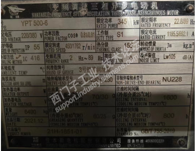 电压:220V/380V 频率:22.8/89Hz 转速:450/1762rpm 电流:1195.5/692.1A