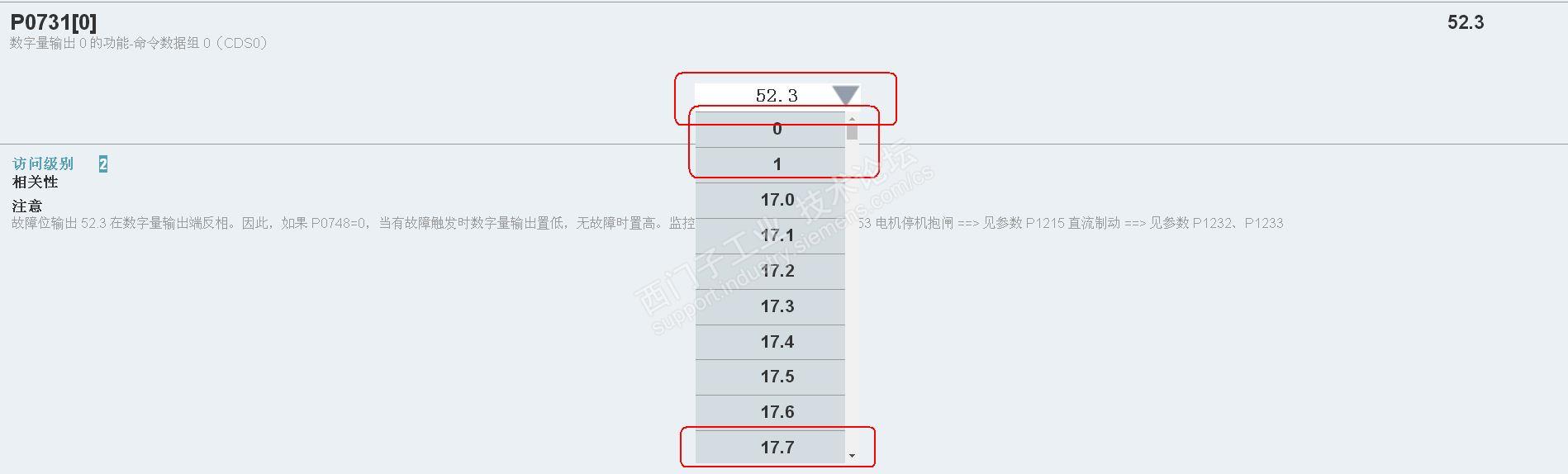 V20变频器的参数P0731[0]里,参数选项的整数0和1,还有
