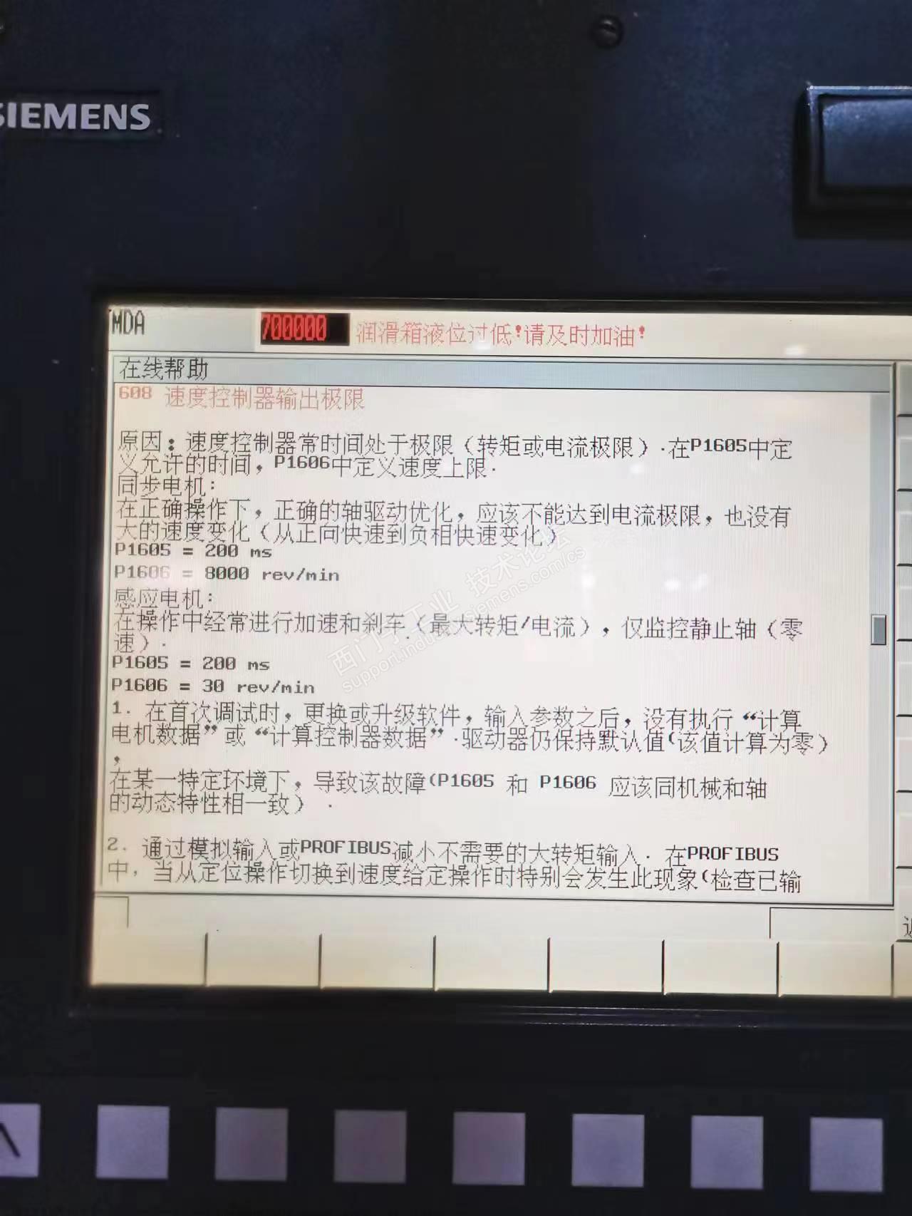 有台西门子802D系统立车,Z轴上下开动倍率超过85%模块上会有608速度控制器输出极限报警,不超过85%运行没有问题。是全闭环控制,更换了电机和模块都没有效果,请问专家是什么原因?