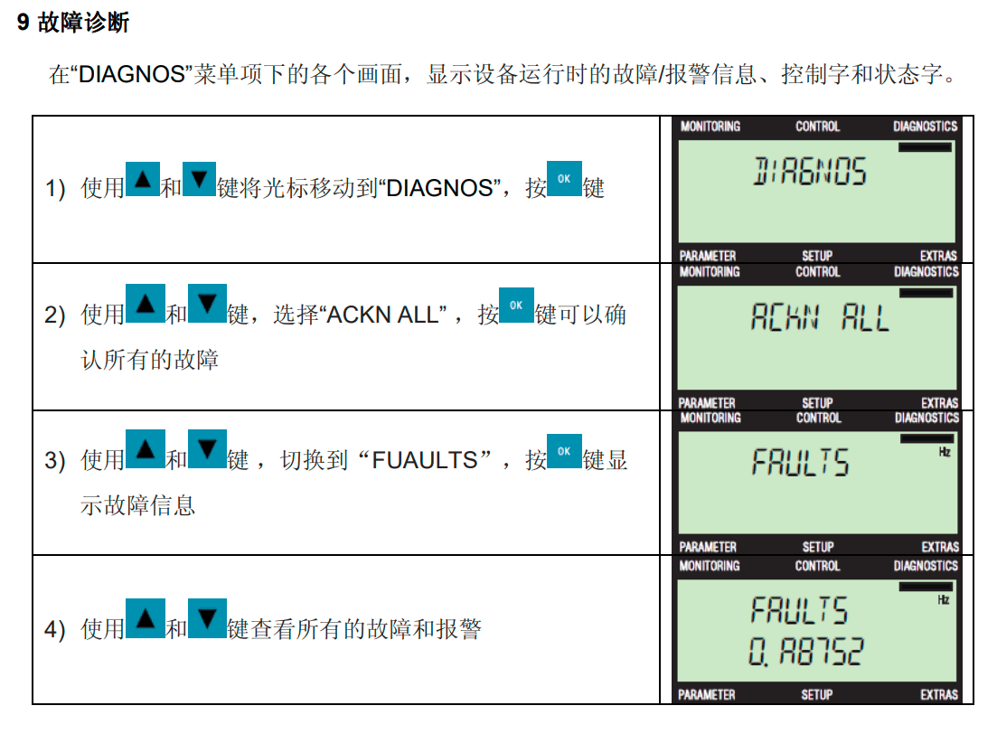 2)使用“上”和“下”键,选择“ACKN ALL” ,按“OK”键可以确认所有的故障