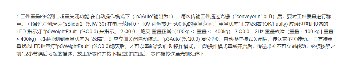 老师,在阶段二章节一数学运算的课后习题中,当工件通过光电开关后检测工件重量,当检测到的重量不在合格范围内之后指示灯闪烁,只有当指示灯熄灭才可以重新启动自动模式,但是这个指示灯熄灭的条件在习题中并没有指出来;习题答案是在In_RANGE前面加一个""s7Acknowledge"变量并且判断工件质量在范围内来复位指示灯,但是这时候工件已经通过光电开关了,重量已经检测完了,即使按下S7变量所在的按钮,指示灯还是不会熄灭,这个该如何理解。