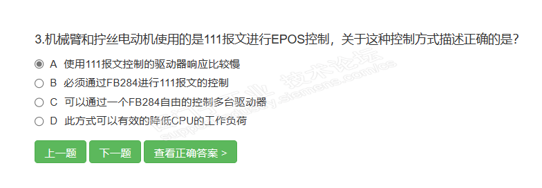 这道题我觉得应该是“机械臂和拧丝电动机使用的是111报文进行EPOS控制,关于这种控制方式描述错误的是?”吧? FB284用111没问题啊;一个FB284走循环也可以控制N台驱动器吧,111报文控制驱动器响应也没那么慢,走的是PN通讯