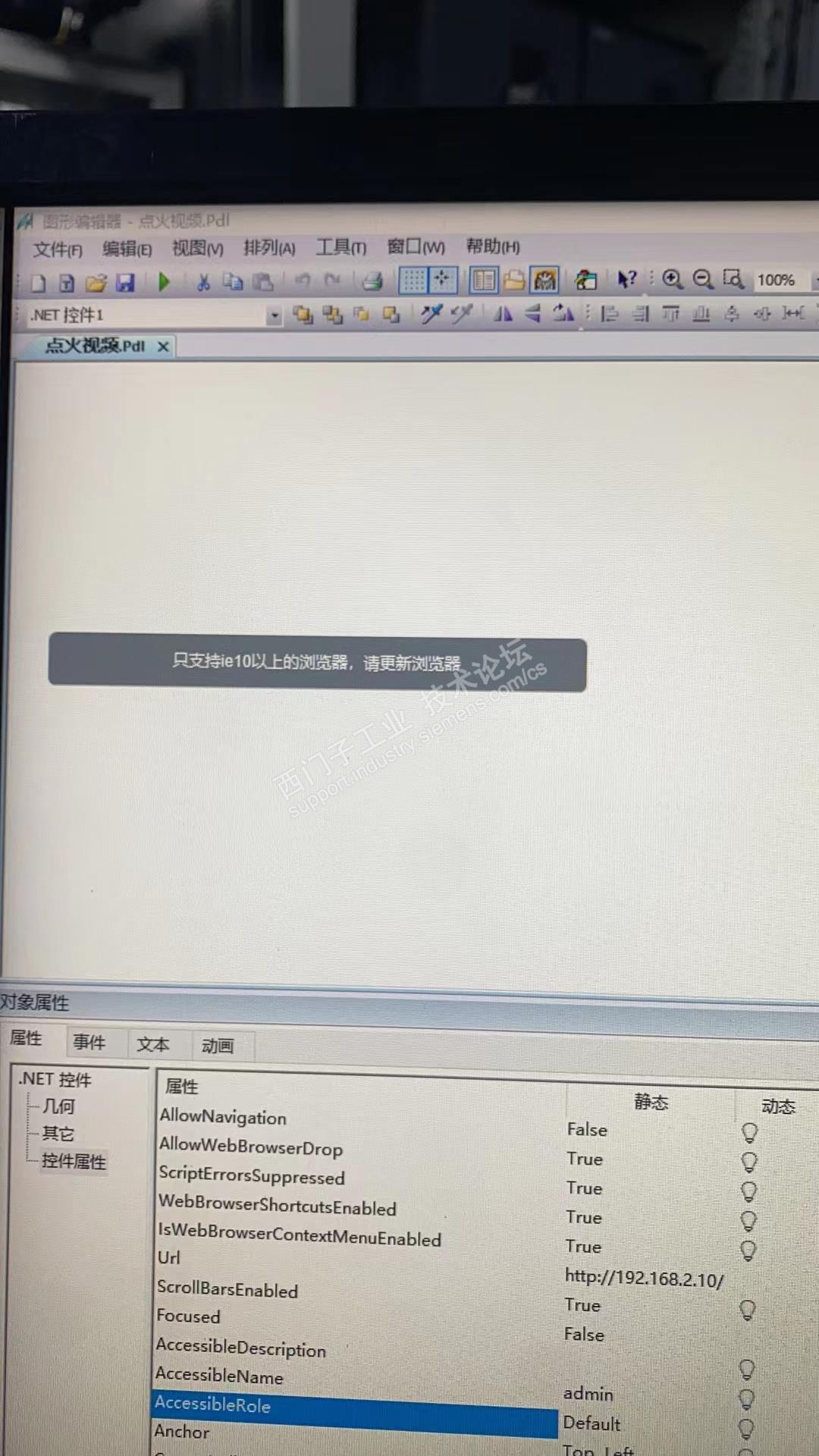 电脑安装了wincc7.5和IE11浏览器,采用WinCC WebBrowser Control控件读取摄像头画面。浏览器打开其它网页均正常,但是进入摄像头网页时提示:“绑定浏览器失败”。未激活时画面中提示“只支持IE10以上的浏览器,请更新浏览器”。另外在浏览器中直接打开摄像头网址是能显示摄像头画面的,请大神们看看是啥问题?
