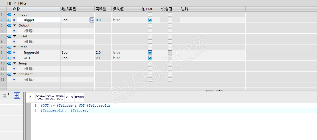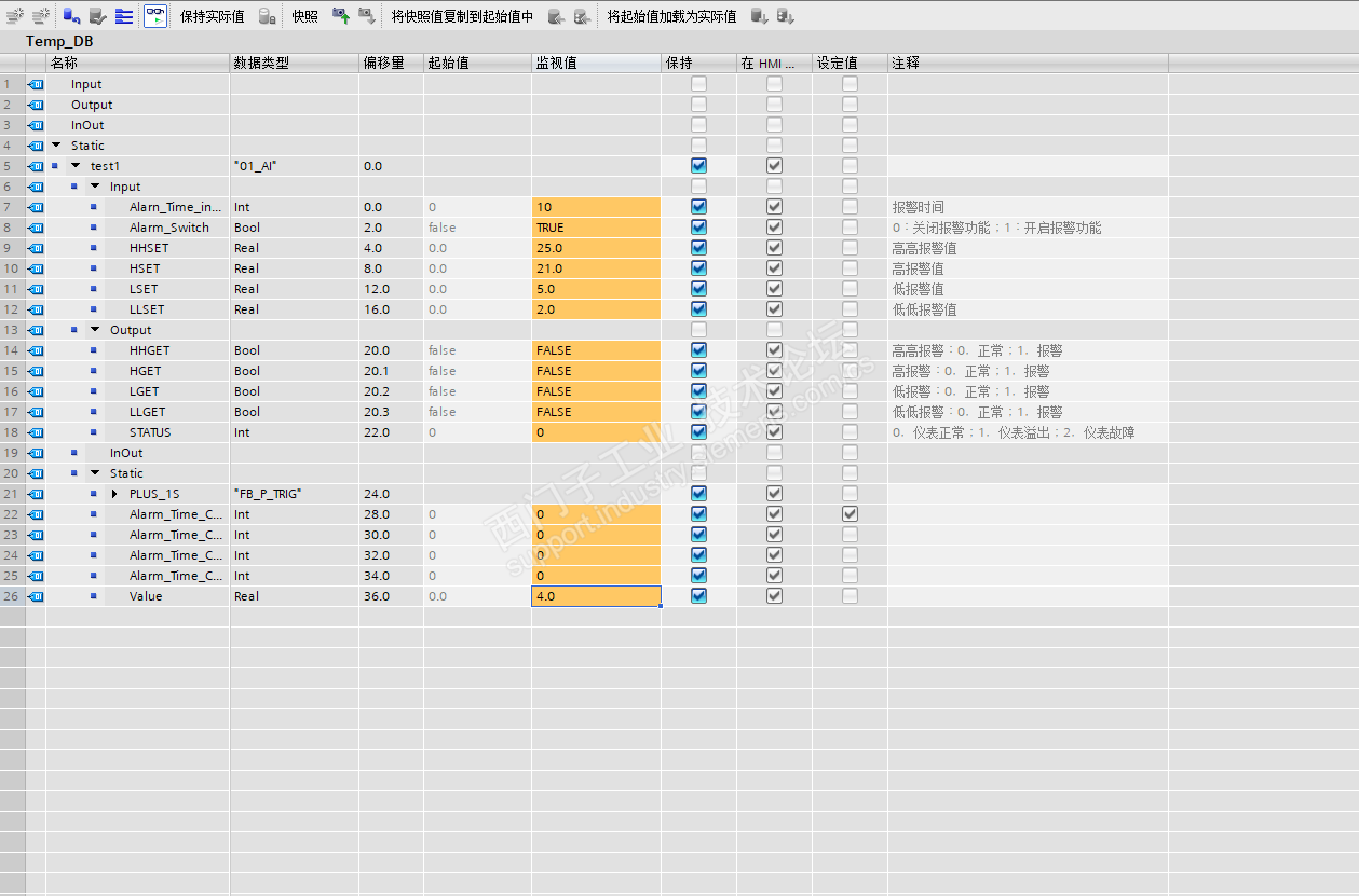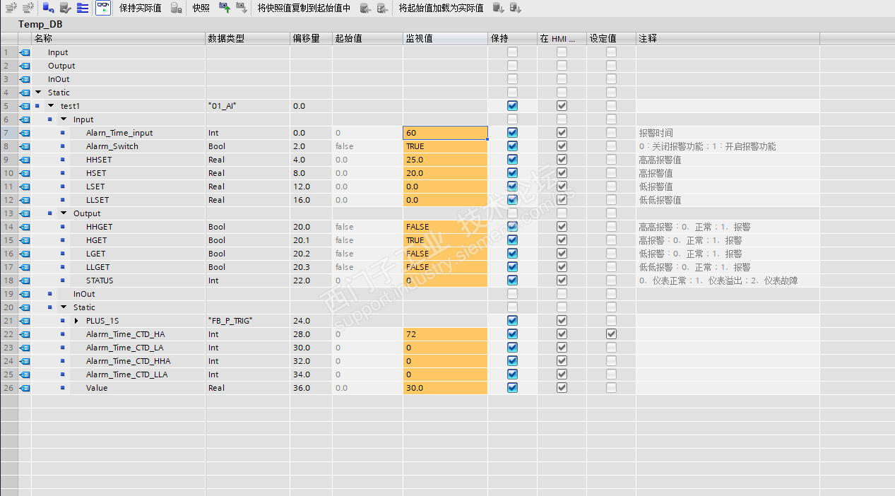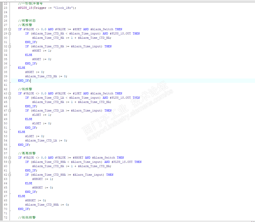 当前用SCL编写一段模拟量报警程序,功能为工程量数值达到报警设定值,延时一段时间后,触发报警,上升沿指令和延时计时都是用SCL实现的。