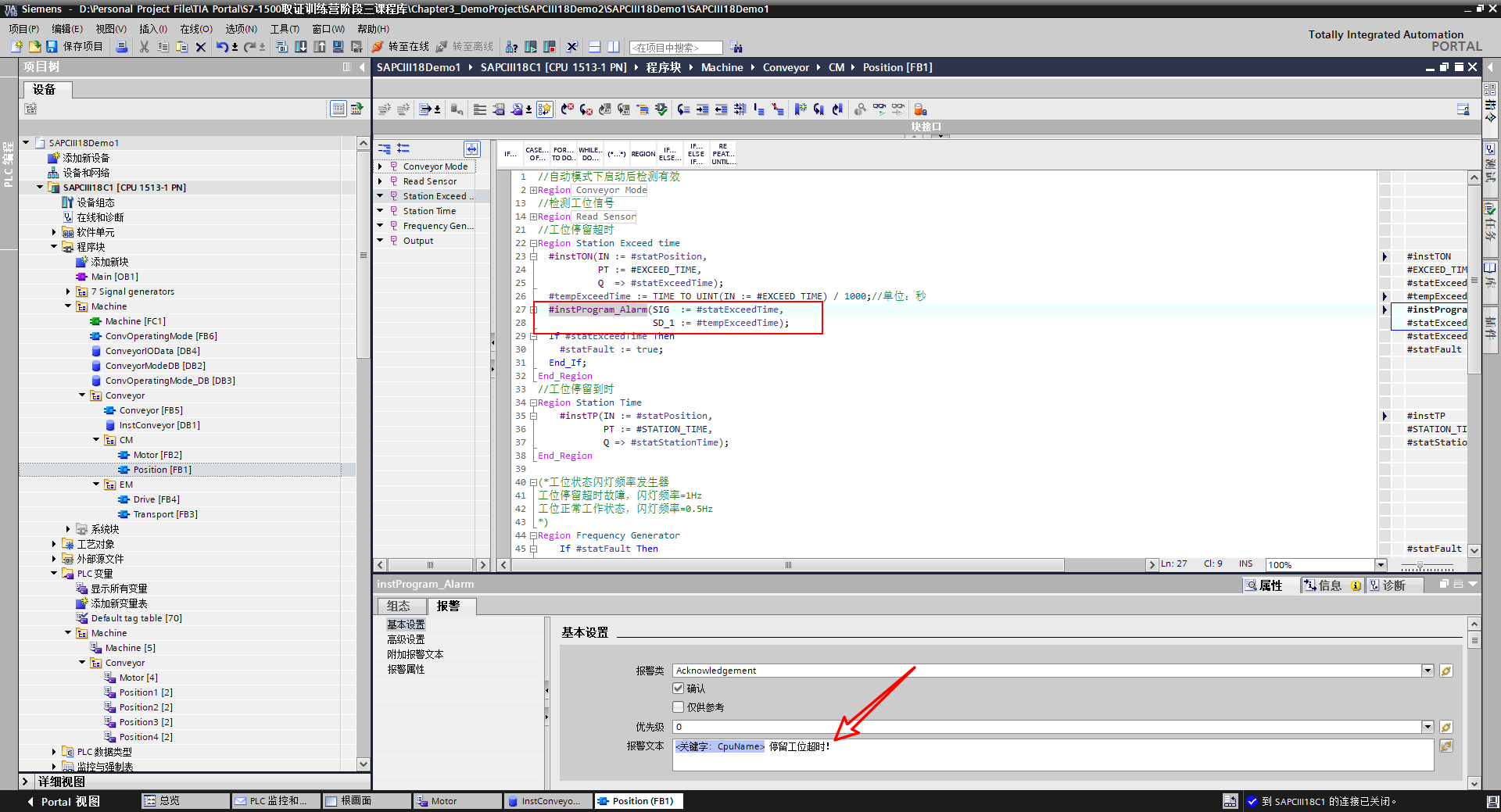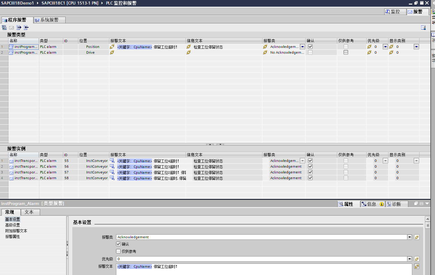 老师,在阶段三章节三的报警消息及用户自定义帮助文档中,我按照视频内容去实现报警消息,当我启动皮带机并且传感器1接通1m后,HMI并没有报警。请老师帮我看看哪里有问题