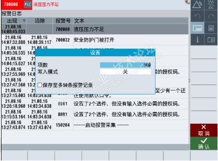 本文仅介绍方法一,设置步骤如下: 进入“诊断”界面,依次按下“报警日志”键、“设置”键,输入“项数”和“写入模式”,按下“确认” 键,完成设置。