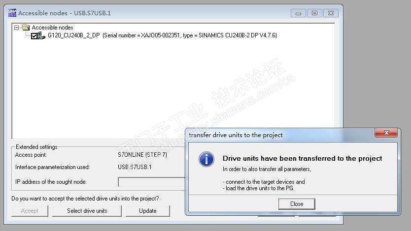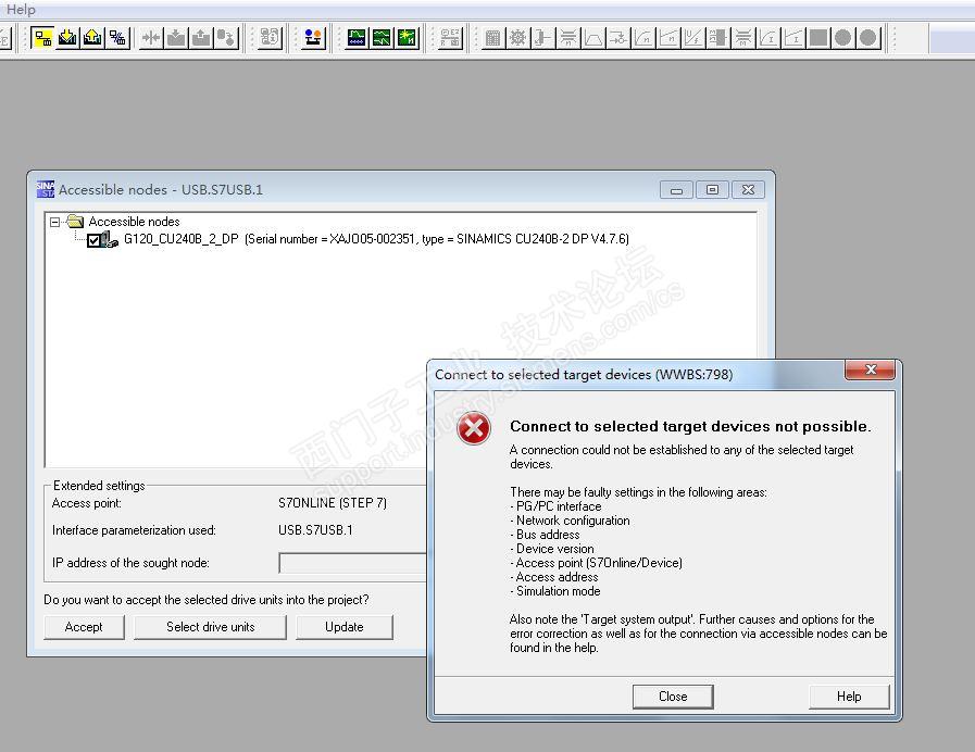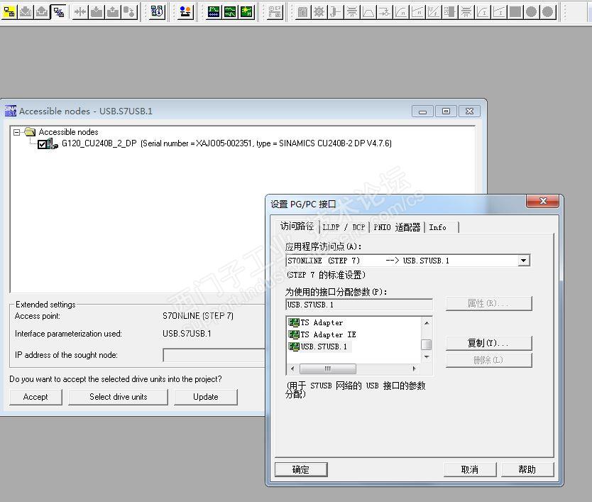 G120变频器,使用的控制单元为CU240B-2DP,通过控制器的USB口使用STARTER软件连接,能认出控制器,点击“Accept”按钮之后,能将驱动添加进项目,随后进行“在线”访问功能,却无法通讯上。具体报错信息见图片。不知道是哪里设置的问题。