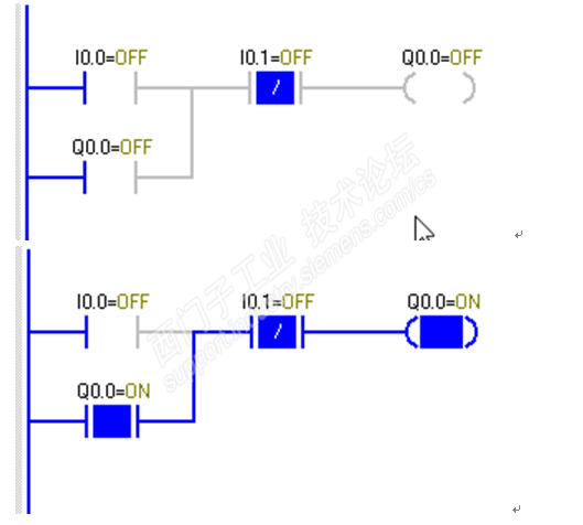 因为在同样的I0.0和I0.1都为0的情况下,我们通过在线监控就可以得到两种不同的结果: