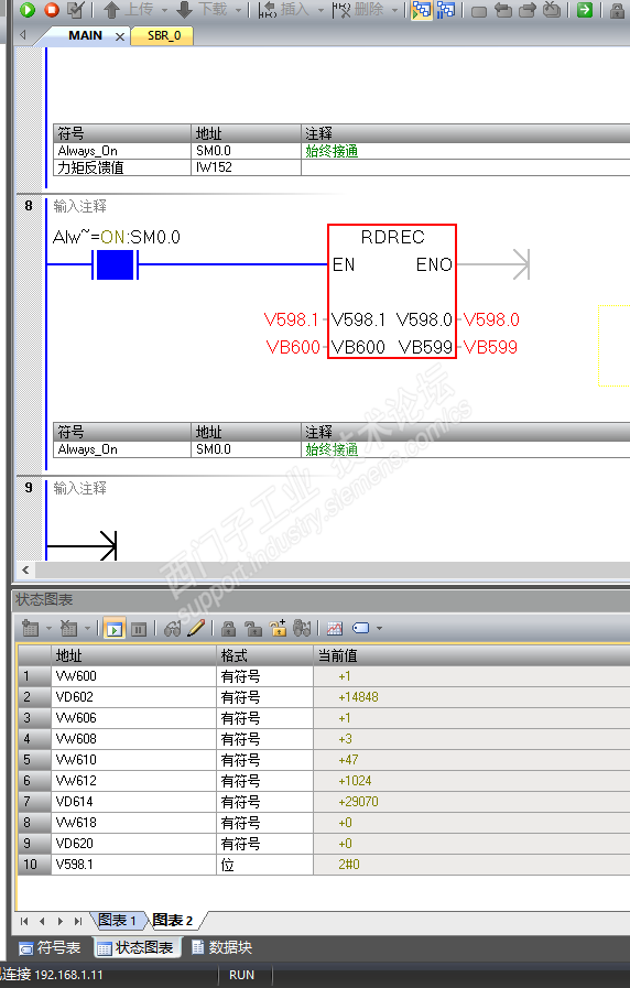 200smart库指令有“SINA_PARA_S”和“PN Read Write Record”,我是直接用Profinet指令“RDREC”读取驱动器参数,但程序出现红色报警: