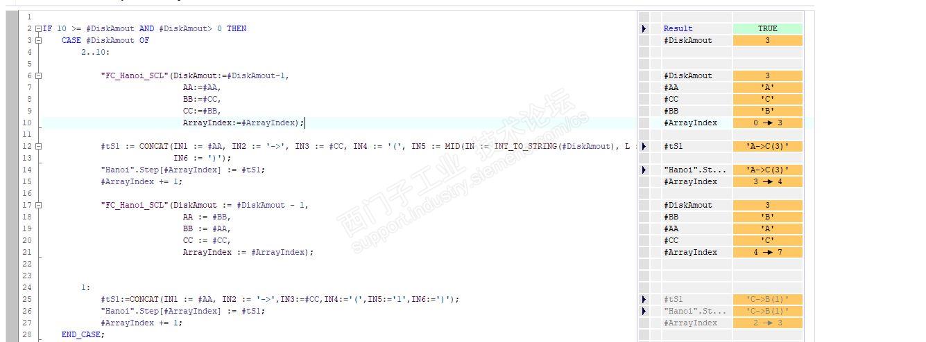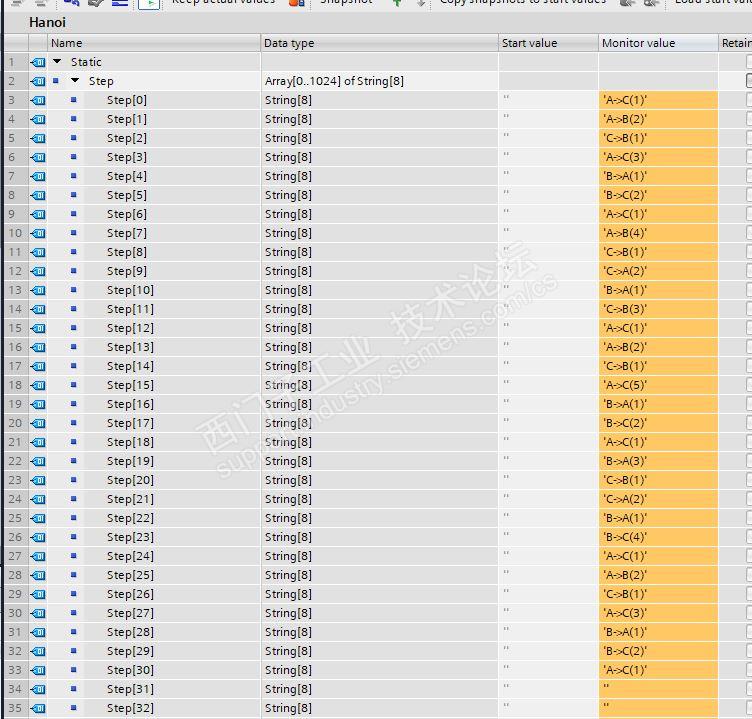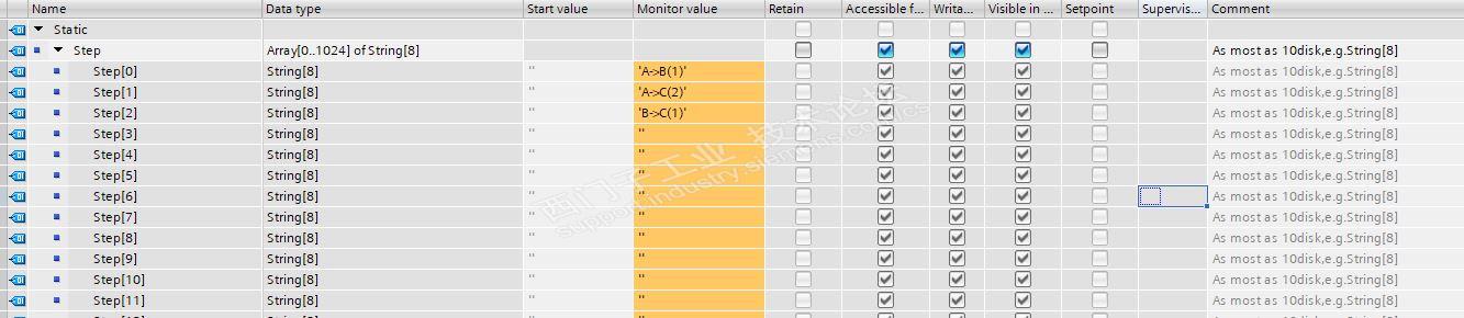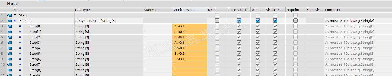 上 C 语言课的时候,都实现过汉诺塔的例子,就在想是不是用PLC也可以实现,因为不确定PLC能否实现递归,所以有了前面的帖子;既然能实现22层,那对汉诺塔来说已经够多了。此处只定义了10层,这样的话应该需要2的10方减1,也就是1023个数组条目,用来存储步骤过程;写这个的目的主要是锻炼逻辑思维,可以把递归当成是有限的多项式展开;