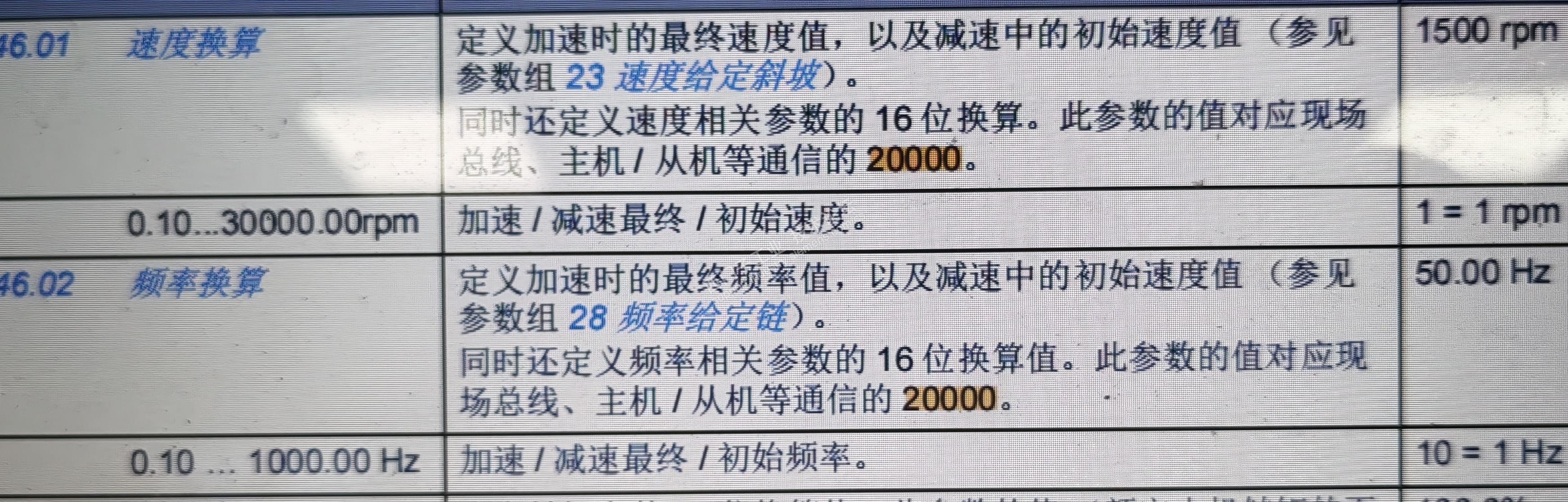 速度如何换算 找了几个样本没看明白,截几个图给大家看看,图二0.1-30000rpm是什么意思啊=-=如果move一个12000给qw给定速度字,换算后是多少呢在变频和实际