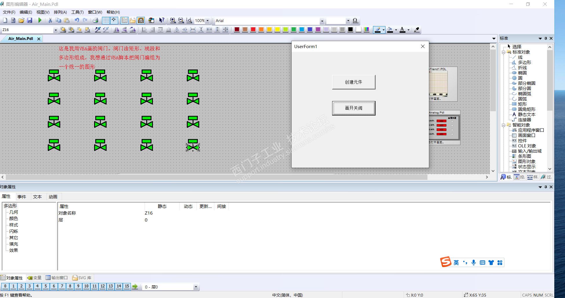 在做wincc 图形编辑器中用到了VBA脚本画了几个阀门。阀门是用矩形、线段和多边形组成。我想把阀门进行编组,做成一个统一的图形。由于阀门数量较多,我想通过VBA脚本把阀门编组。