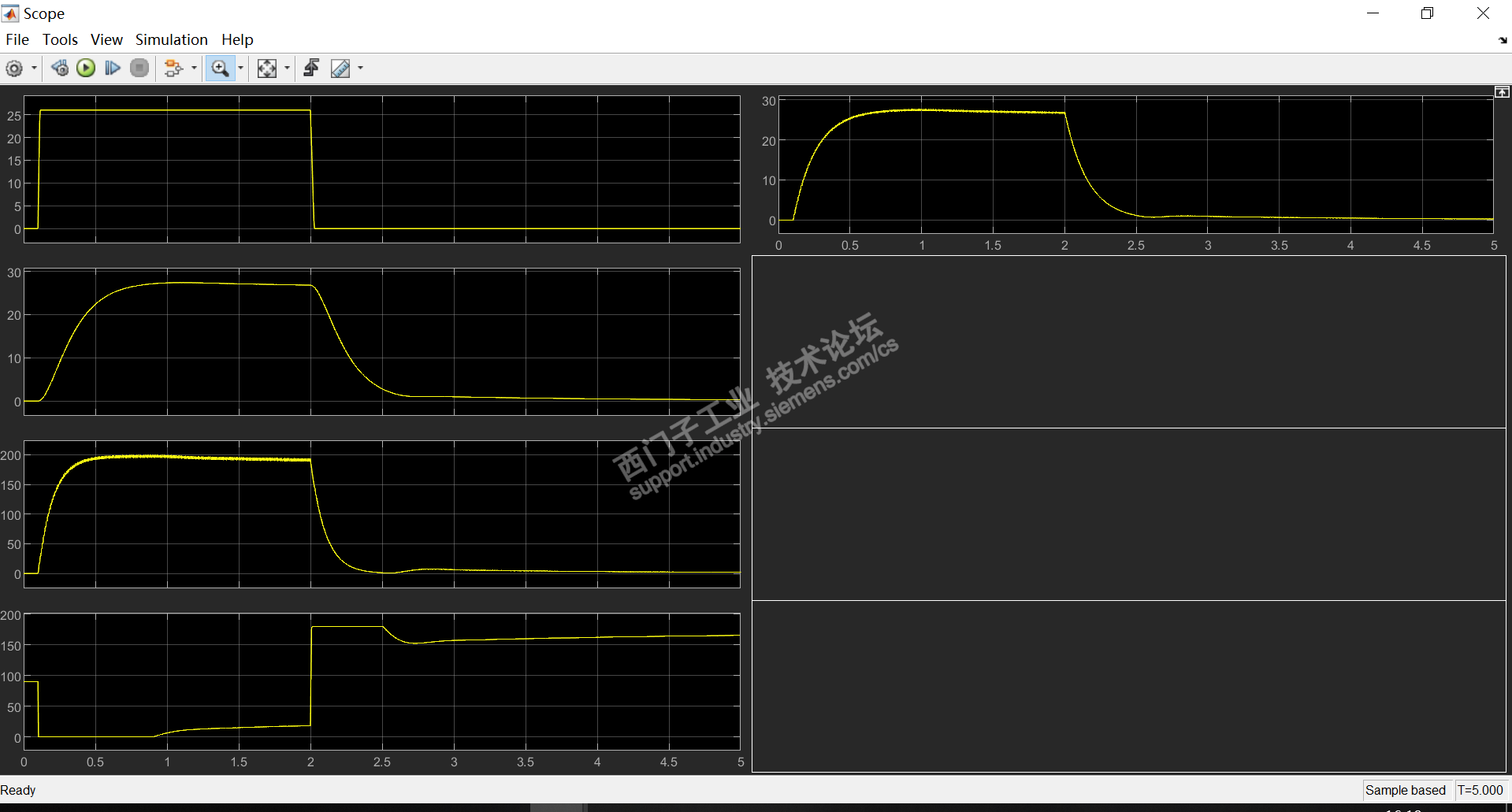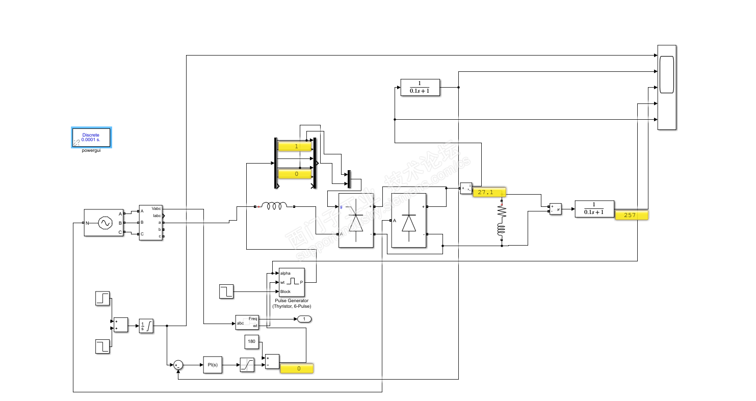 依次是: 历次给定(26安) 励磁反馈(0.1s滤波) 励磁回路电压 触发角 励磁反馈(无滤波)