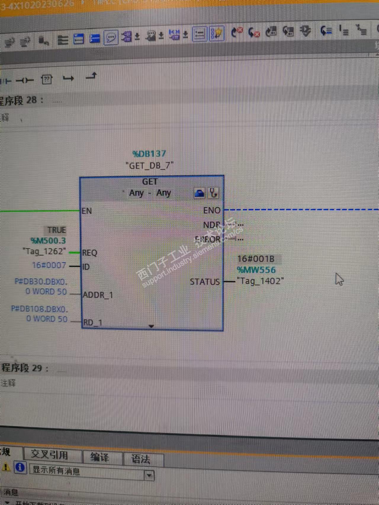 请问大家 我用的博图软件 在S7-300这边做的单边通讯 网络组态中显示已经连接(状态为绿色) 但用 GET 通讯块 STATUS上报16#001B的错误 REQ端用的系统自带时钟脉冲 S7-400也用的博图 也需要进行网络组态吗
